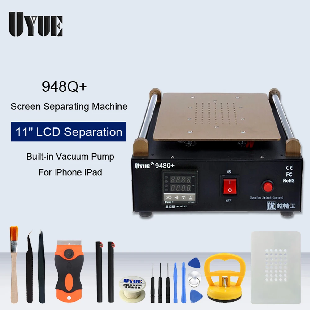 Ultra-quiet built-in vacuum separator, maximum support 11-inch screen isolatedThis product is a removable IPAD tablet market common to all mobile phones and tablets Model: UYUE948Q+Power: 400WPower: 110V-250VSize: 355 * 275 * 175 Product Features:1. Just put on LCD on the heating panel, turn on "Vacuum Pump" switch, then you can separate the glass. And the LCD is firmly fixed on the panel while separating.2. The shell of vacuum LCD Separator is metal. And it's better than back light vacuum LCD Separator.3. The Vacuum LCD separator equip with four bearings. It's more convenient when separating;4. The surface of heating plate is very smooth. It makes fix broken LCD firmly;5. The LCD separator equip with anti-slip mounting seats. It makes your work smoothly and decreases the opportunity of damaging LCD assembly.6. This machine set can help separate the cell phone's touch screen from LCD, or touch screen from front glass lens. Specifications:1. Working Voltage: 110v-220v2. Separate LCD front glass screen3. Automatic separator hot plate machine4. Low noise, economical and practical5. Fast, high efficiency, and easy operations with vacuum pump inside to suck the LCD down to the hot plate so you don't have to have does problems trying clamping the LCD down this is the newest model also good for any side of LCD phone